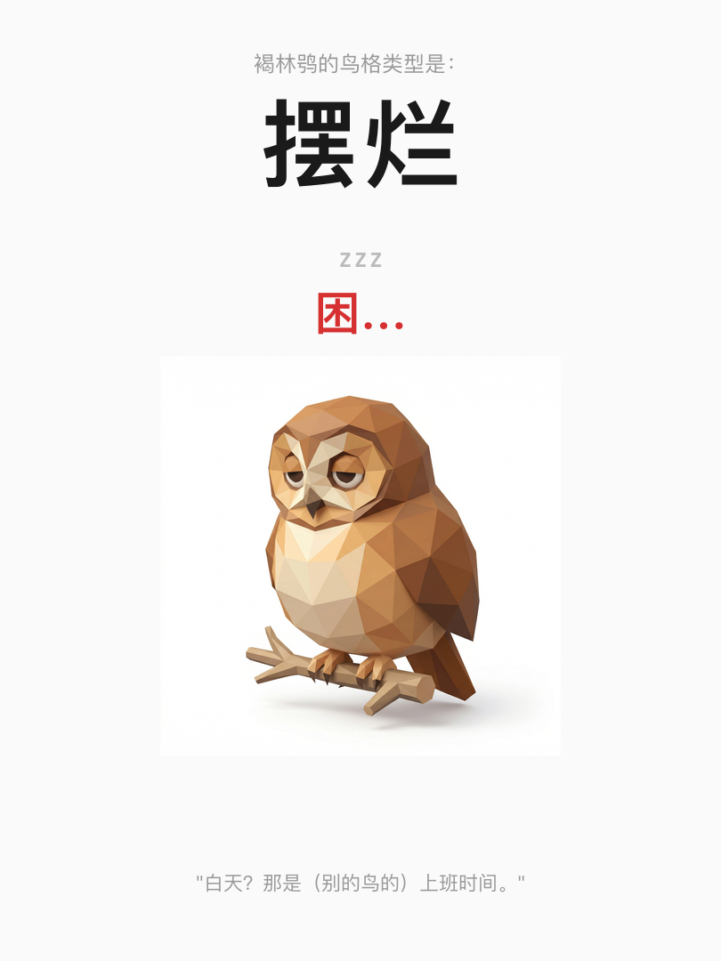 褐林鸮白天一动不动——不是懒,是它把全部精力都留给了半夜。 你也是。你不是不行动,你只是有自己的服务器时间。 全世界都在"早起打卡""晨间routine",你的态度是——凭什么。 你最清醒的时候是凌晨两点。最有灵感的时候是所有正常鸟都睡了的时候。