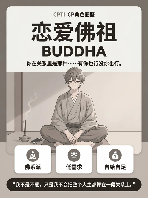 你在恋爱里的佛系程度已经修炼到了出家级别。对方回不回消息你无所谓,约会取消你也无所谓,连吵架你都懒得吵——因为你觉得"有什么好吵的,吵赢了又怎样"。你的安全感来自自己,你不太需要对方的确认和回应。你觉得最好的伴侣关系就是"各过各的,需要的时候在就行"。你的对象可能会怀疑你到底爱不爱TA,但你知道答案是:爱,只是方式不太一样。