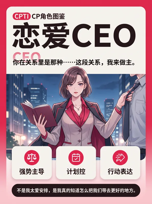 你在这段关系里就是甲方。约会去哪你安排,吵架了你定基调,连和好的节奏都是你说了算。但你不是控制狂——你只是天然觉得自己比对方更会规划。你的爱是"我帮你想好了",你的表达方式是行动而非嘴甜。你会把两个人的纪念日、出行计划、甚至吵架后的和解步骤都安排得明明白白。对方可能觉得你有点强势,但离了你TA也不知道周末干什么。