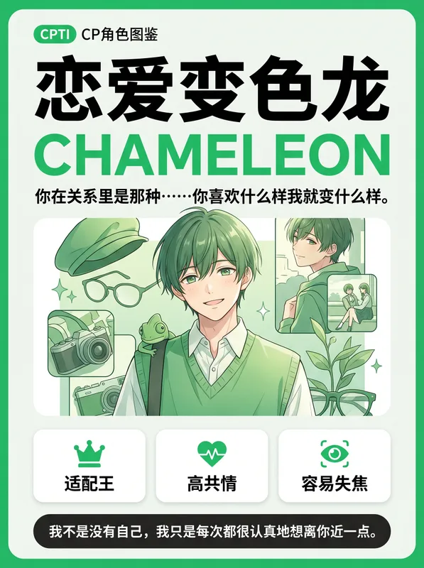 你在关系里的适应能力极强——对方喜欢吃辣你就练辣,对方喜欢健身你就办卡,对方喜欢看足球你就学越位规则。你不觉得这叫"没自我",你觉得这叫"爱的主动融入"。你在关系里偏配合型,但你的配合不是委曲求全,而是你真心觉得"和对方同频"是一件快乐的事。唯一的问题是:时间久了,你可能会忘记自己原来喜欢什么。
