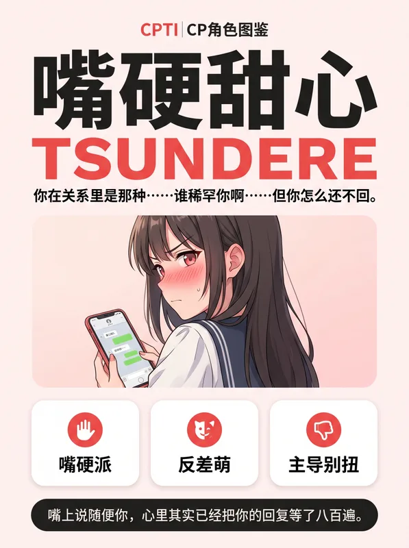 你的恋爱人设就是"口嫌体正直"。嘴上说着"随便你",心里已经刷了八遍对方的朋友圈。嘴上说"不用你管",对方真不管了你比谁都急。你在关系里偏主导,但你的主导方式很别扭——你不会直接说"我想你",你会说"你是不是很久没找我了"。你的对象一开始觉得你高冷,后来发现你只是嘴硬。你的反差萌就是你最大的魅力。