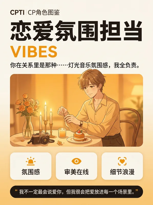 你是两个人之间的氛围制造机。约会你提前踩点找最好看的咖啡店,纪念日你准备对方完全想不到的惊喜,连吵架你都能选一个有氛围的地点展开对话。你的爱不是大声说出来的,而是藏在每一个精心安排的细节里。你在关系里更偏配合,但你的配合不是没主见——你是把主见全用在了"让这段关系更美好"上。