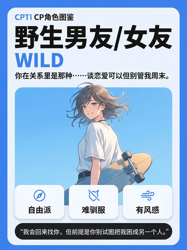 你在关系里的核心诉求就是自由。你可以很甜、可以很体贴、可以在需要的时候出现,但你绝对不能接受"被管着"。你有自己的朋友圈、自己的爱好、自己的周末计划,恋爱是你生活的一部分,不是全部。你不是不在乎,你只是觉得两个人都有自己的空间才是健康的关系。你的对象有时觉得你像一只养不熟的猫——你主动凑过来的时候甜死人,但你想走的时候谁也拦不住。